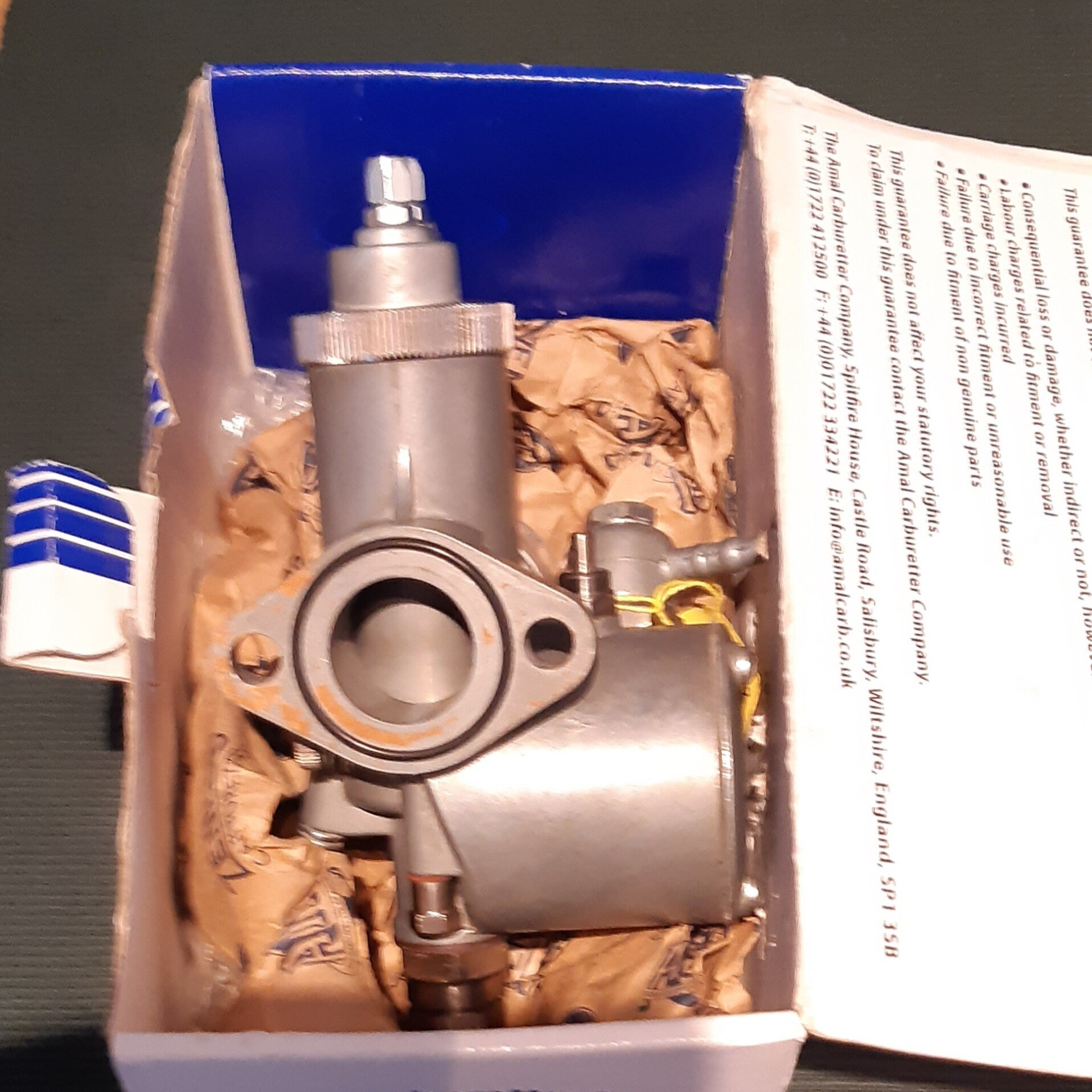 An original Amal remanufactured Carb made from aluminium using a Hard Anodised Throttle Valve. These mave been made since 2014.
